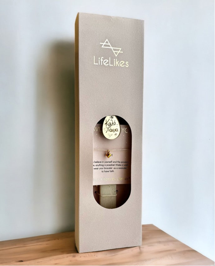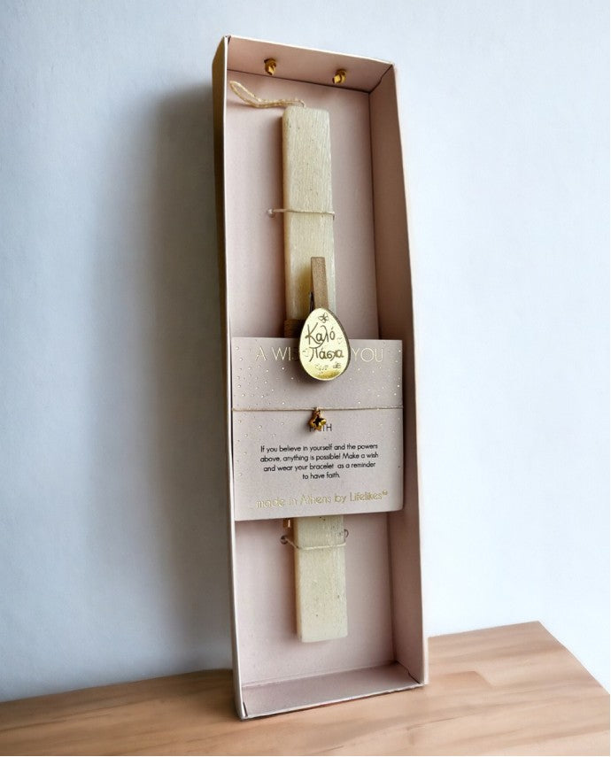 Ευχήσου "Καλό Πάσχα" με τη χειροποίητη μπεζ λαμπάδα, σε ροζ συρταρωτό κουτί, με χρυσοτυπία. Η λαμπάδα συνοδεύεται από ένα βραχιόλι - charm με κρεμαστό αστέρι, από επιχρυσωμενο ορείχαλκο 18Κ, και κάρτα με ευχές.