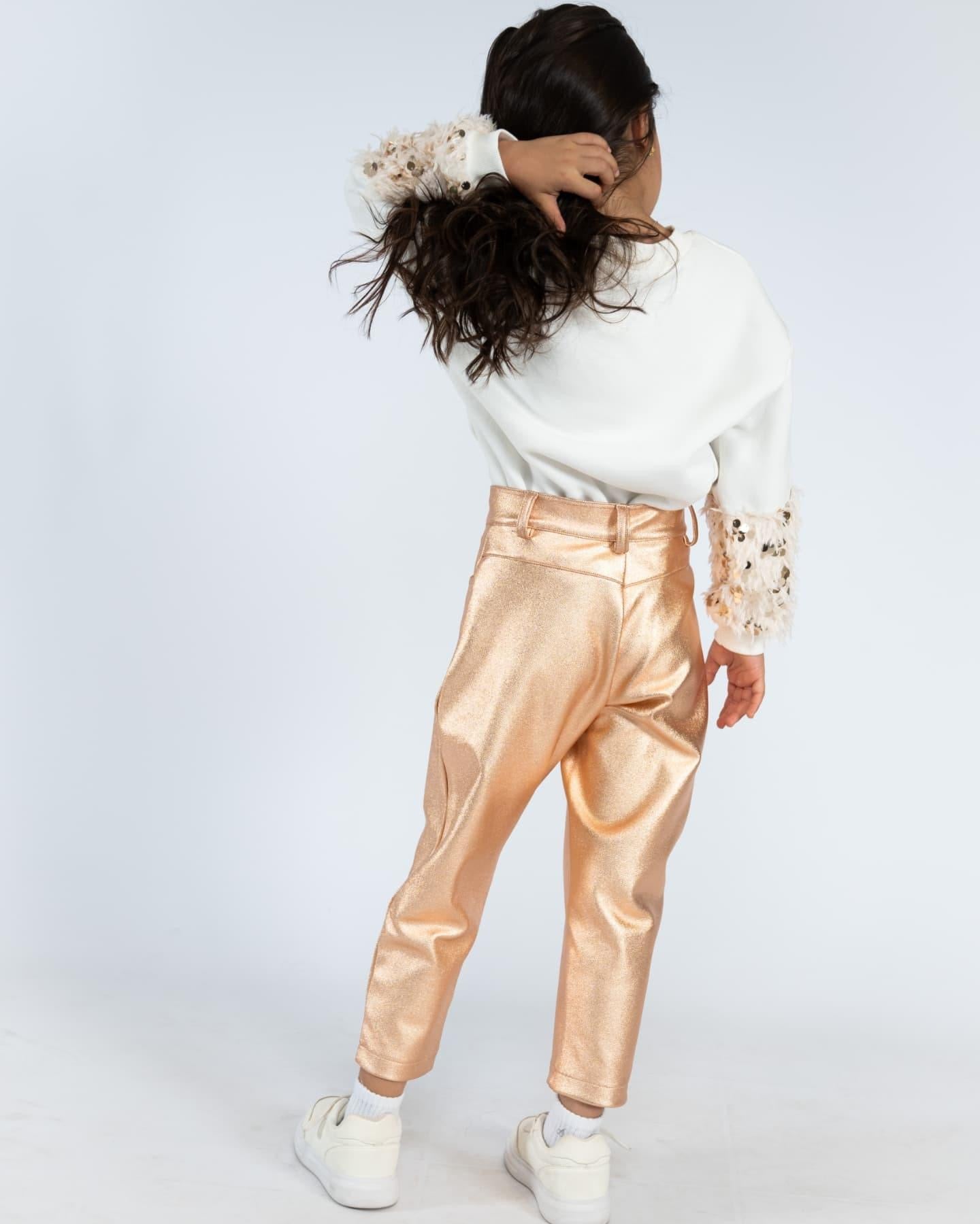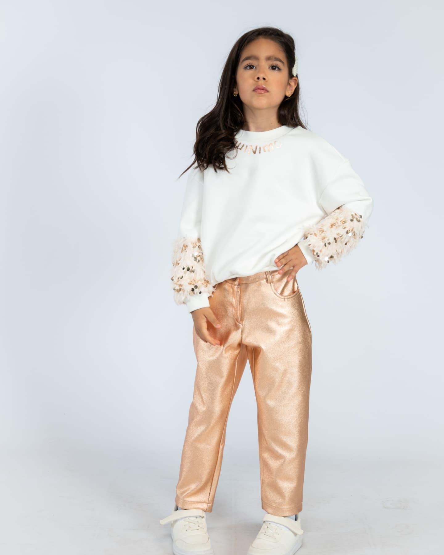 Μπλούζα φούτερ με λεπτομέρειες από πούπουλα και παντελόνι τύπου δερματίνη γυαλιστερό.