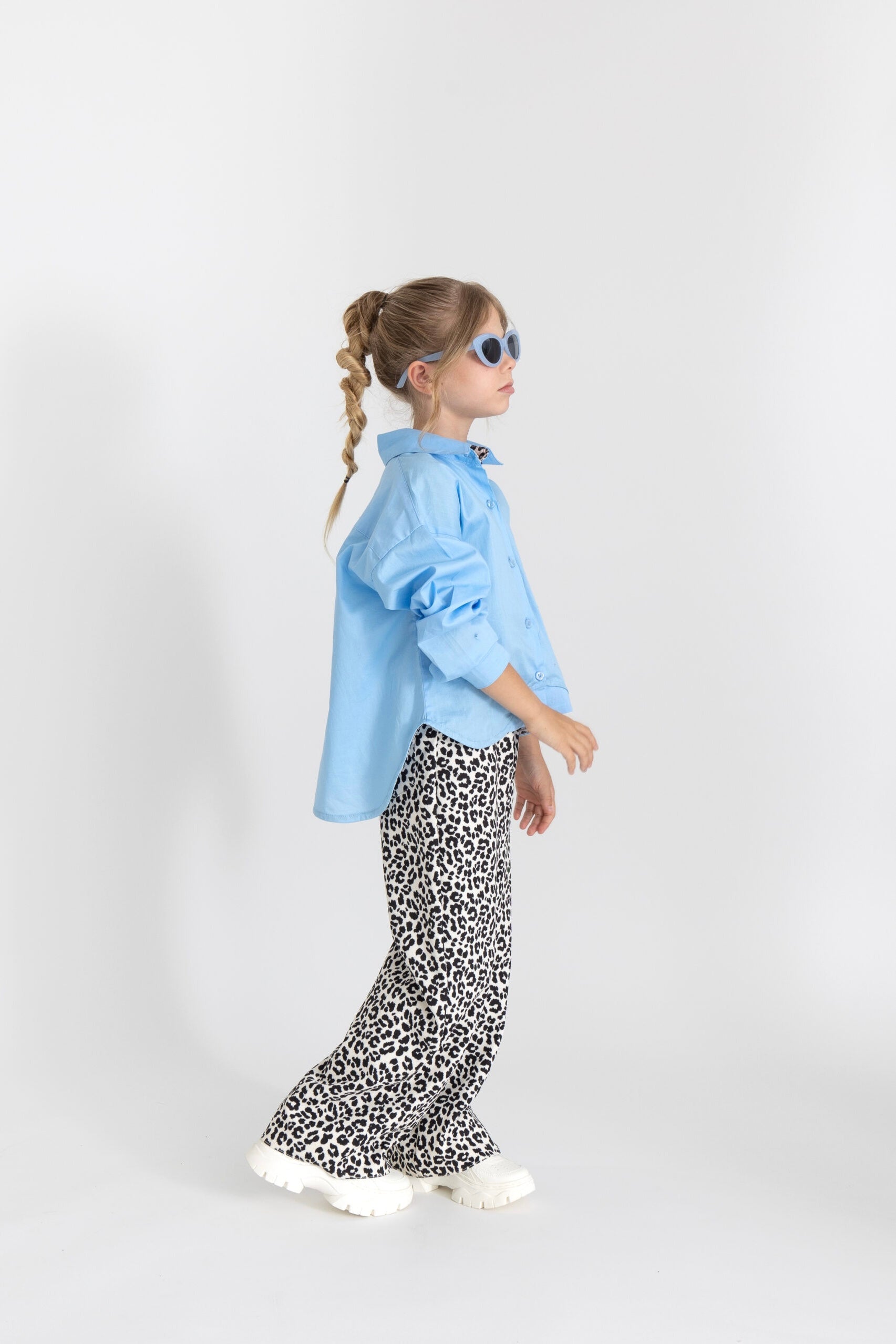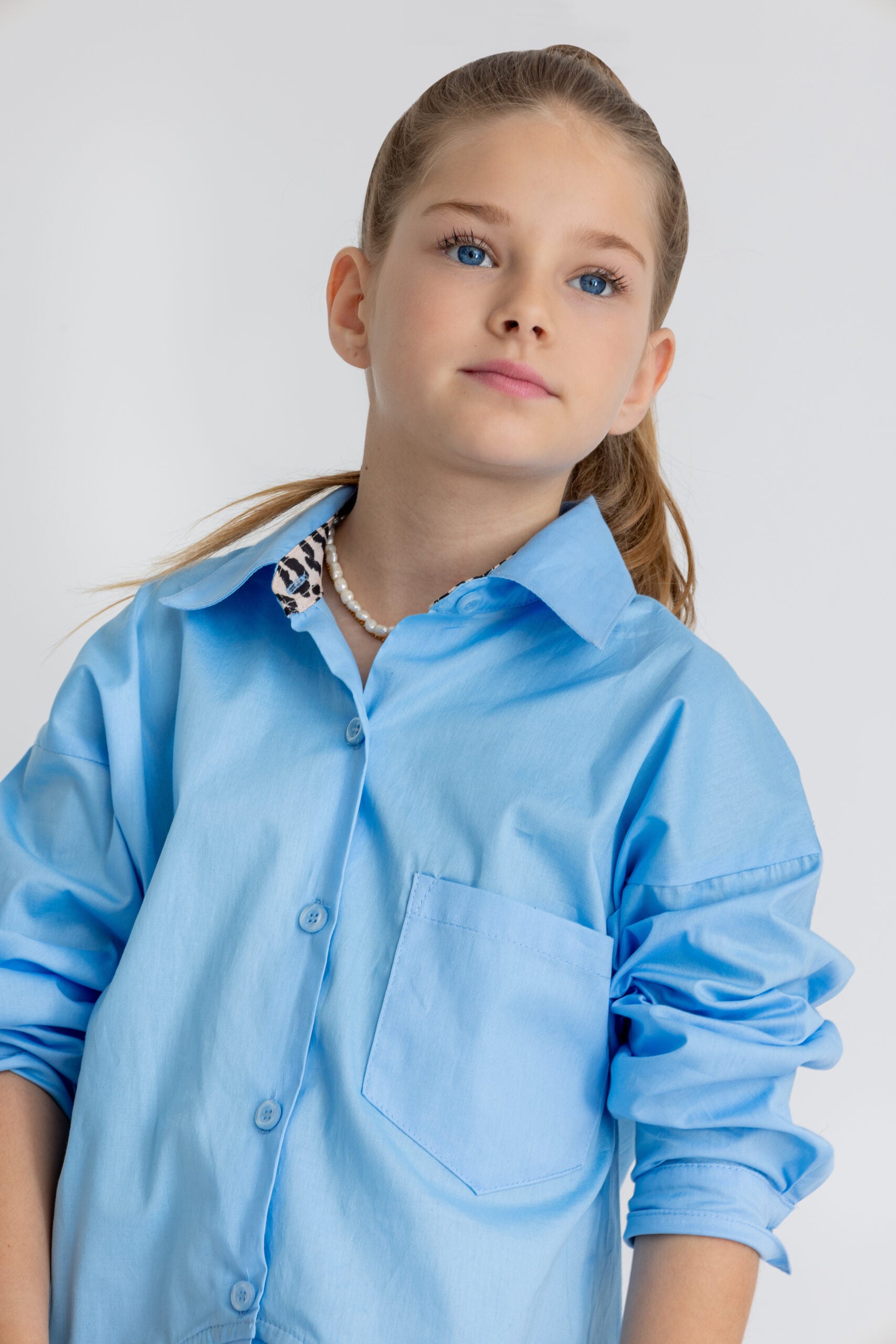 Πουκάμισο ποπλίνα με πέτο γιακά, ασύμμετρα τελείώματα με λεπτομέρεια λεοπάρ ρέλια. Τετράγωνη τσέπη μπροστά.