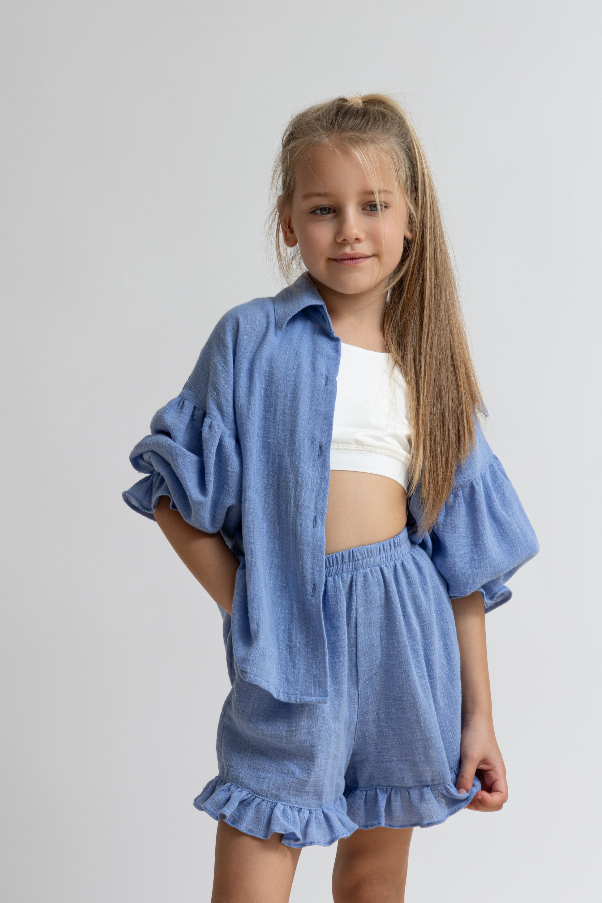 Σύνολο από βαμβακερό ύφασμα τύπου λινό/γάζα. Πουκαμίσα σε άνετη γραμμή με πέτο γιακά και κούμπωμα μπροστά με κουμπιά. Μανίκι τρουακάρ με λάστιχο που μπορεί να γίνει και κοντομάνικο.