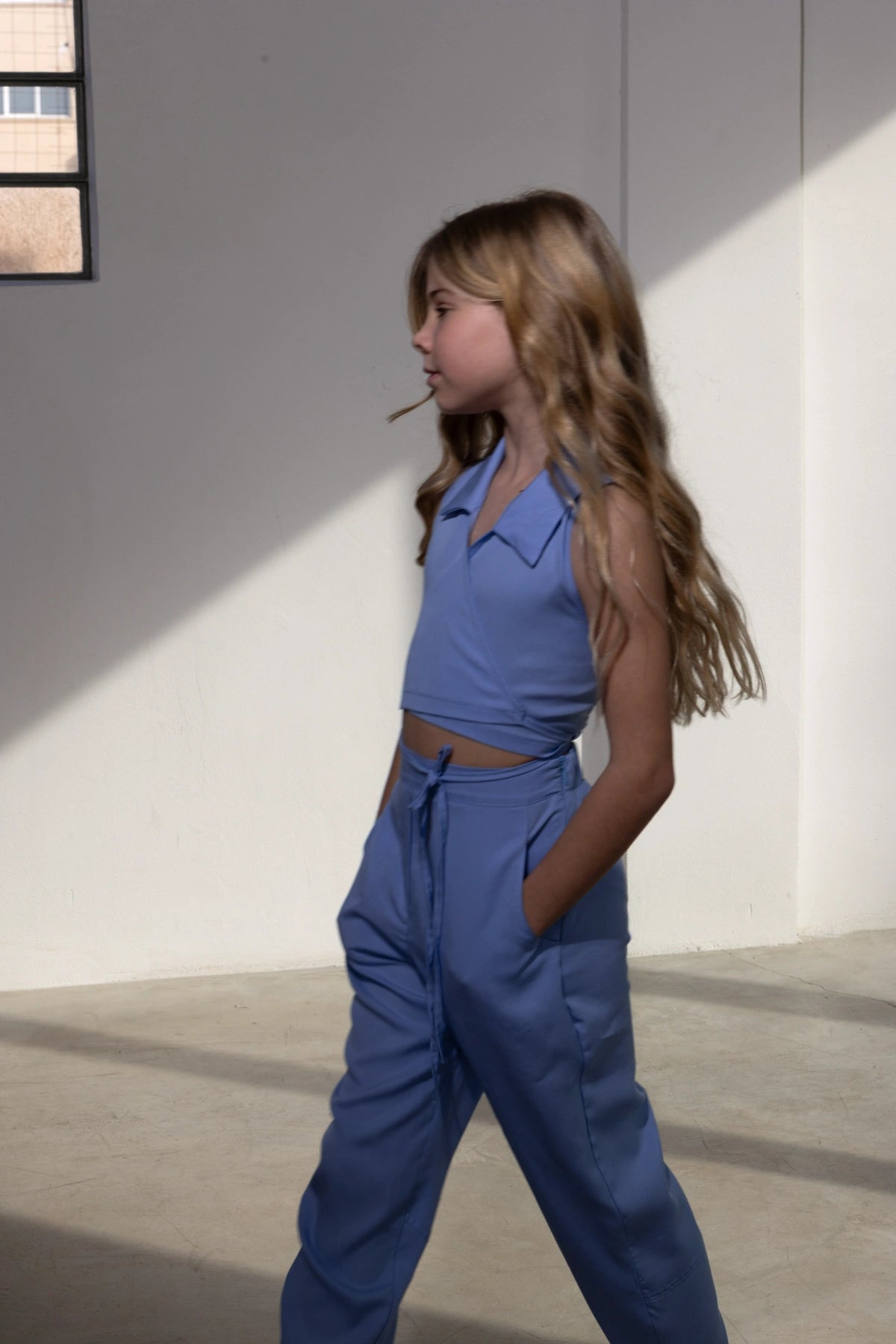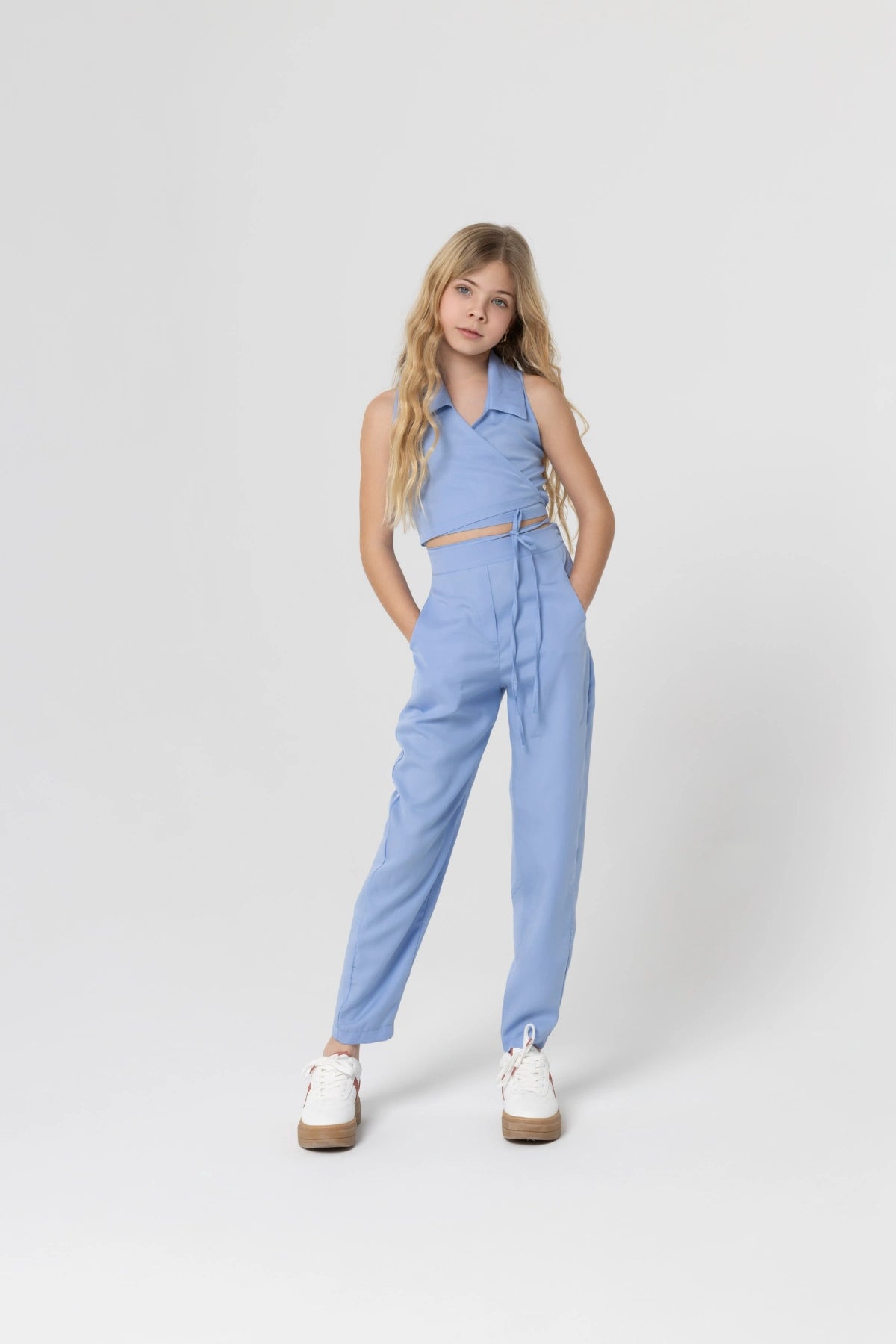 Σύνολο με αμάνικο πουκάμισο κρουαζέ ,ανοιχτή πλάτη με λάστιχο σφηκοφωλιά και σχέδιο στον λαιμό. Παντελόνι ψηλόμεσο σε loose γραμμή με πλαϊνές τσέπες και άνοιγμα φερμουάρ. Σχέδιο με ραφές στο πίσω μέρος. Το ζωνάκι στη μέση έχει λάστιχο.