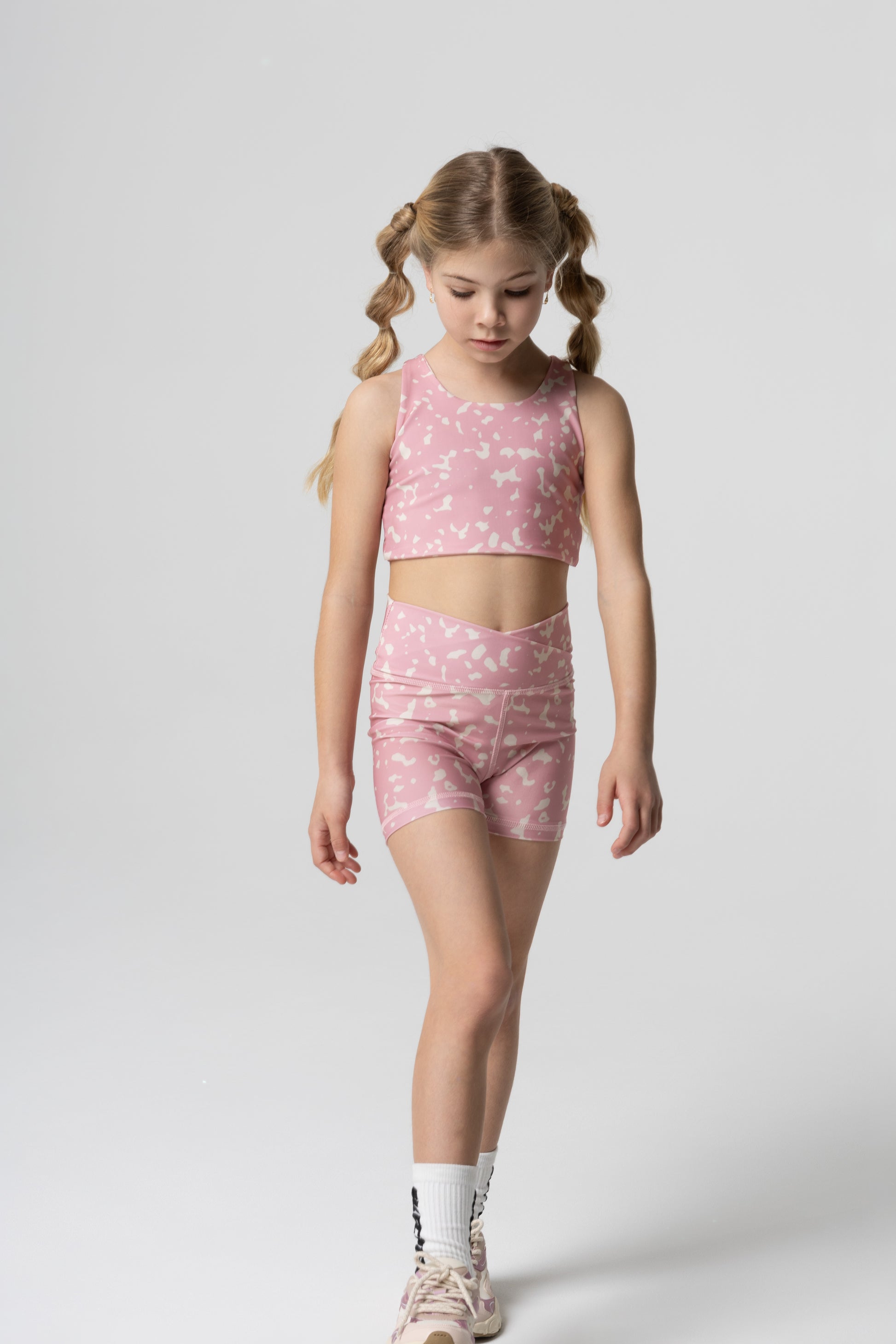 Τοπ αθλητικό με τιράντες, σχέδιο με άνοιγμα στην πλάτη και διακοσμητικό στοιχείο με το logo. Ποδηλατικό κολάν με σχέδιο διπλό ζωνάκι στην μέση. Το ύφασμα είναι ελαστικό και έχει allover τύπωμα.