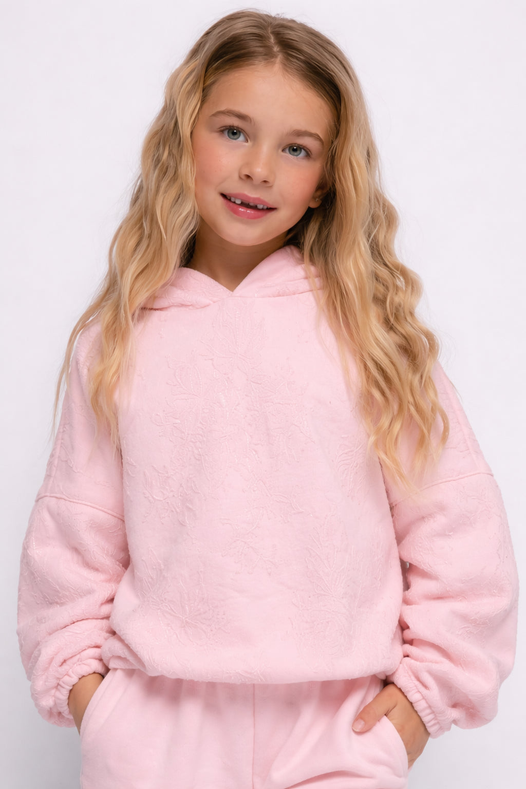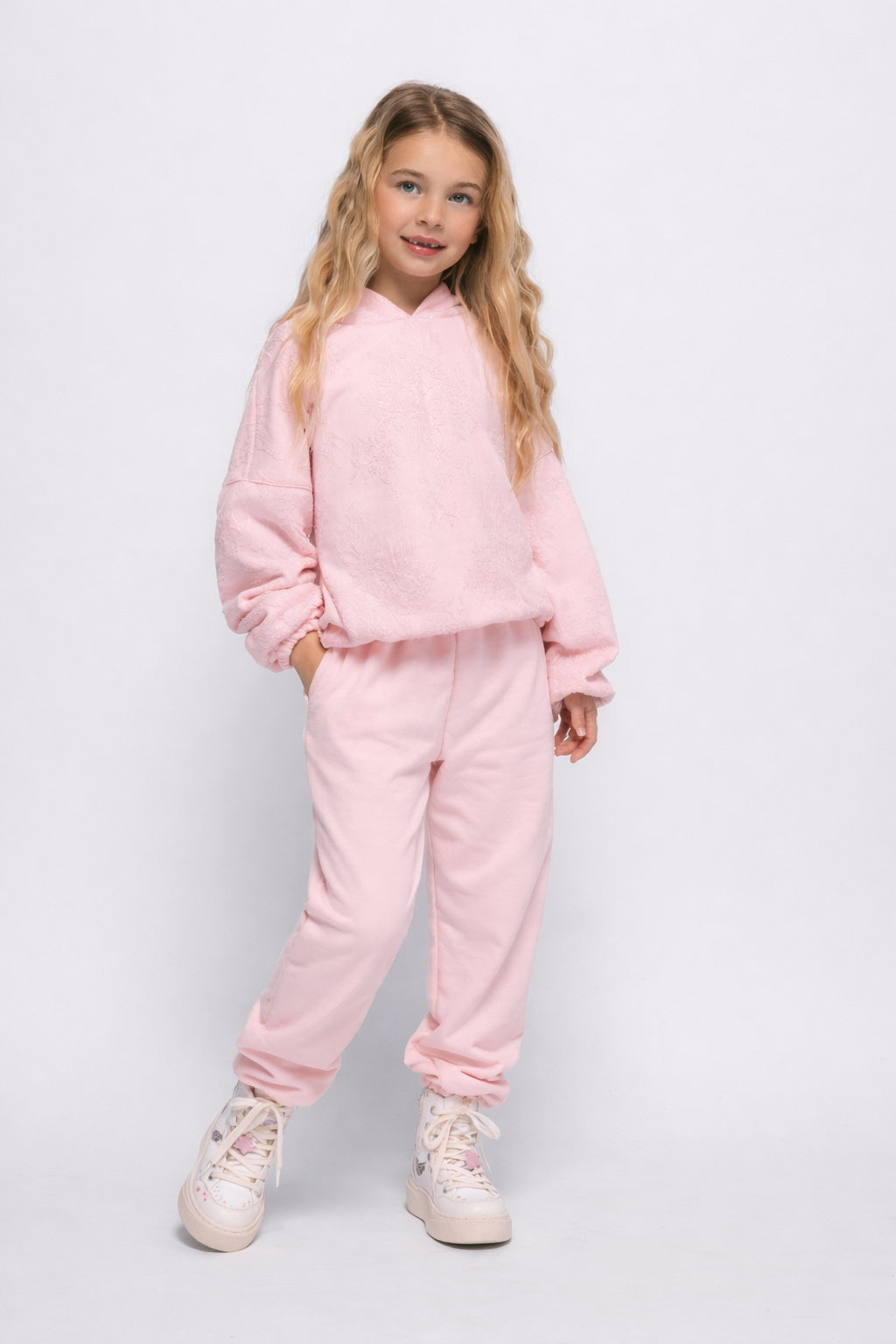 Σετ που αποτελείται από φούτερ μπλούζα με κουκούλα σε συνδυασμό με ύφασμα δαντέλα. Λάστιχο στις μανσέτες και στην μέση. Το παντελόνι είναι σε ίσια γραμμή με πλαϊνές τσέπες και λάστιχο στη μέση και στο κάτω μέρος.