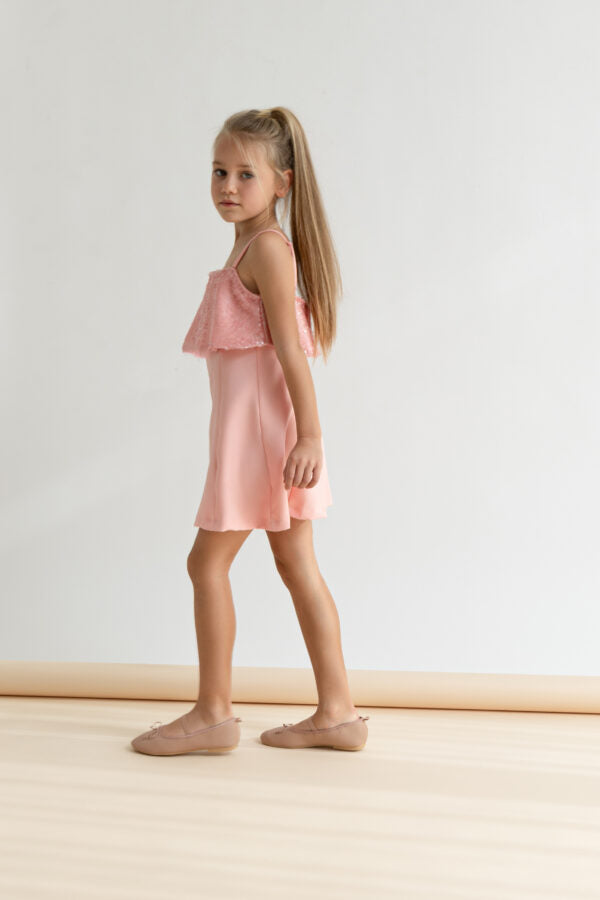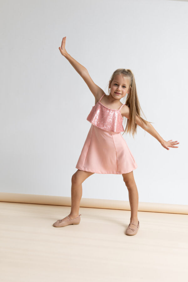 Φόρεμα σε συνδυασμό υφασμάτων με παγέτα στο επάνω μέρος. Ρυθμιζόμνες λεπτές τιράντες