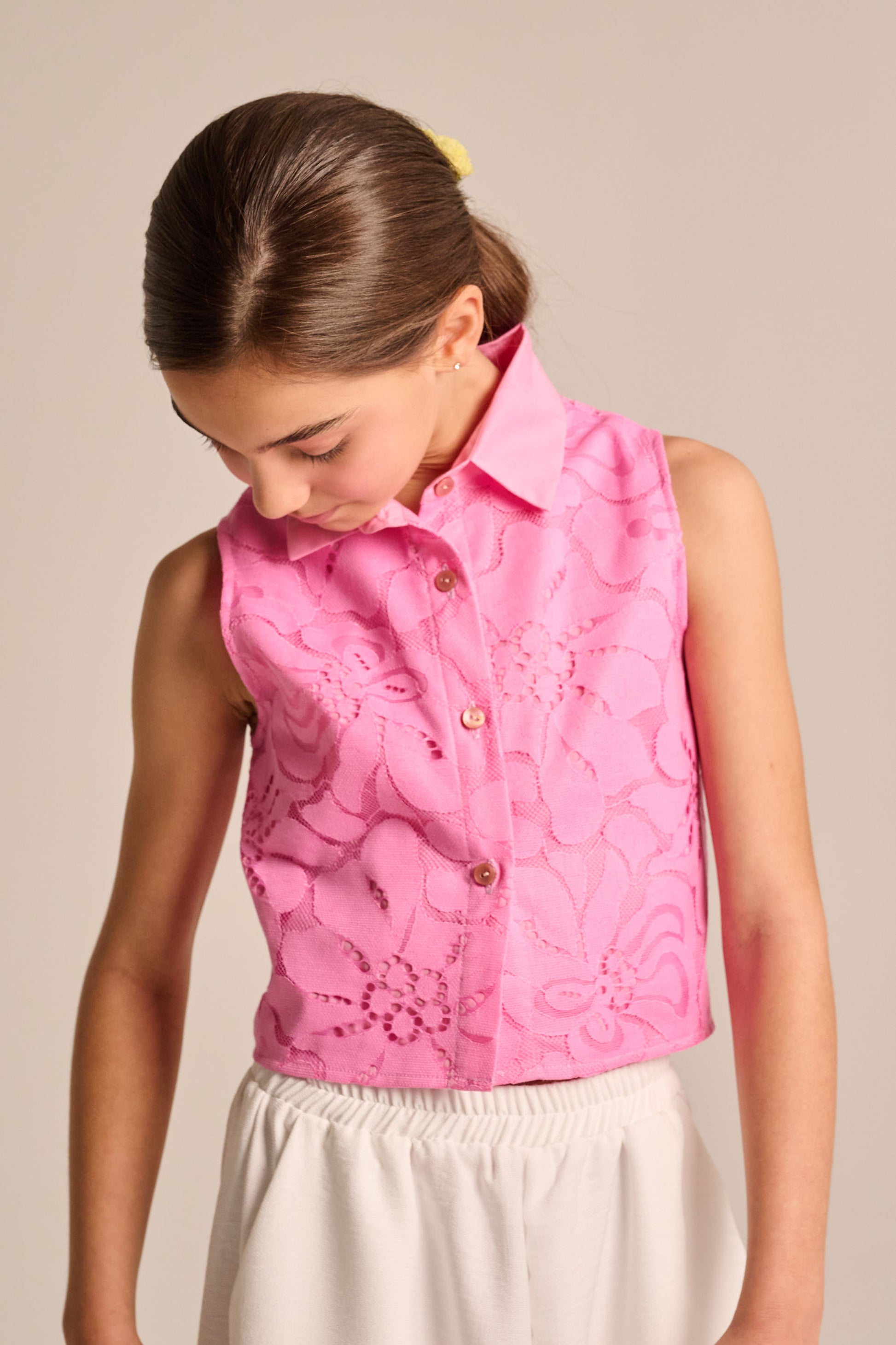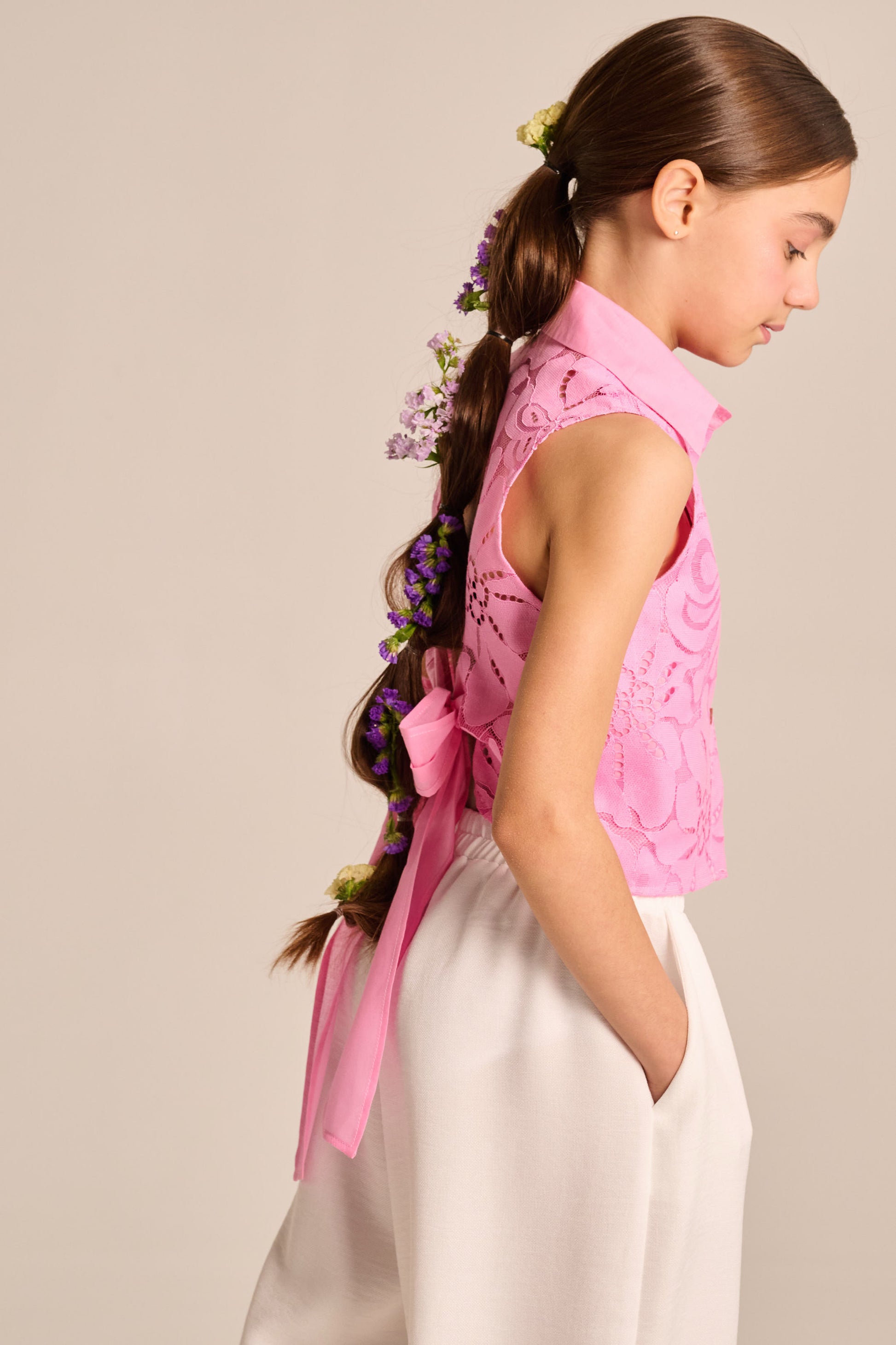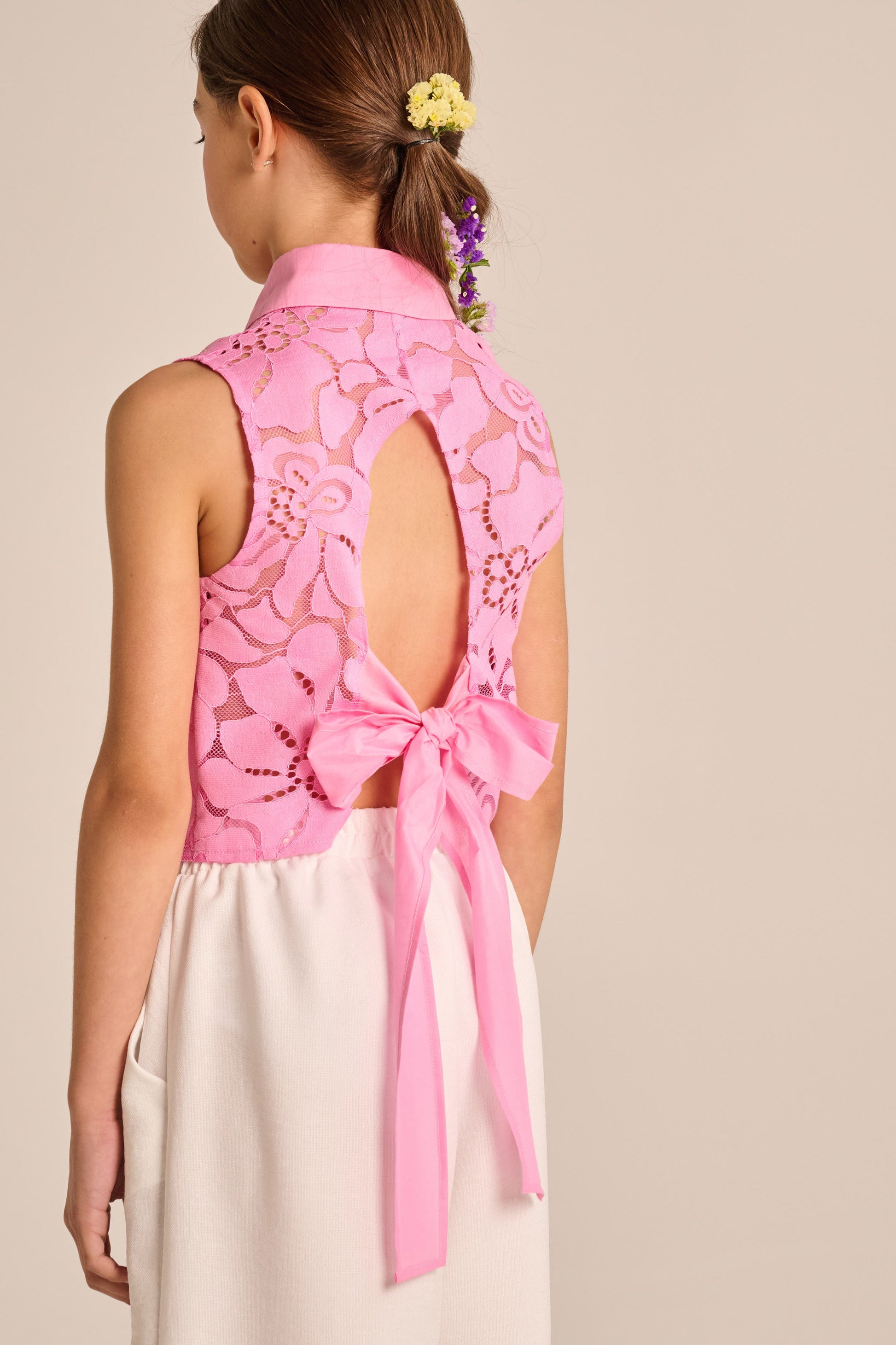 Πουκάμισο αμάνικο φτιαγμένο από ροζ δαντέλα με λουλουδάτο μοτίβο, διαθέτει άνοιγμα στην πλάτη που δένει με μια εντυπωσιακή ροζ κορδέλα σε φιόγκο