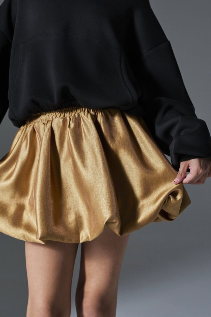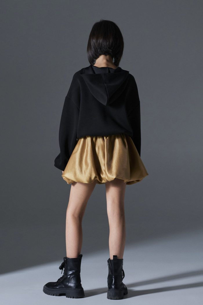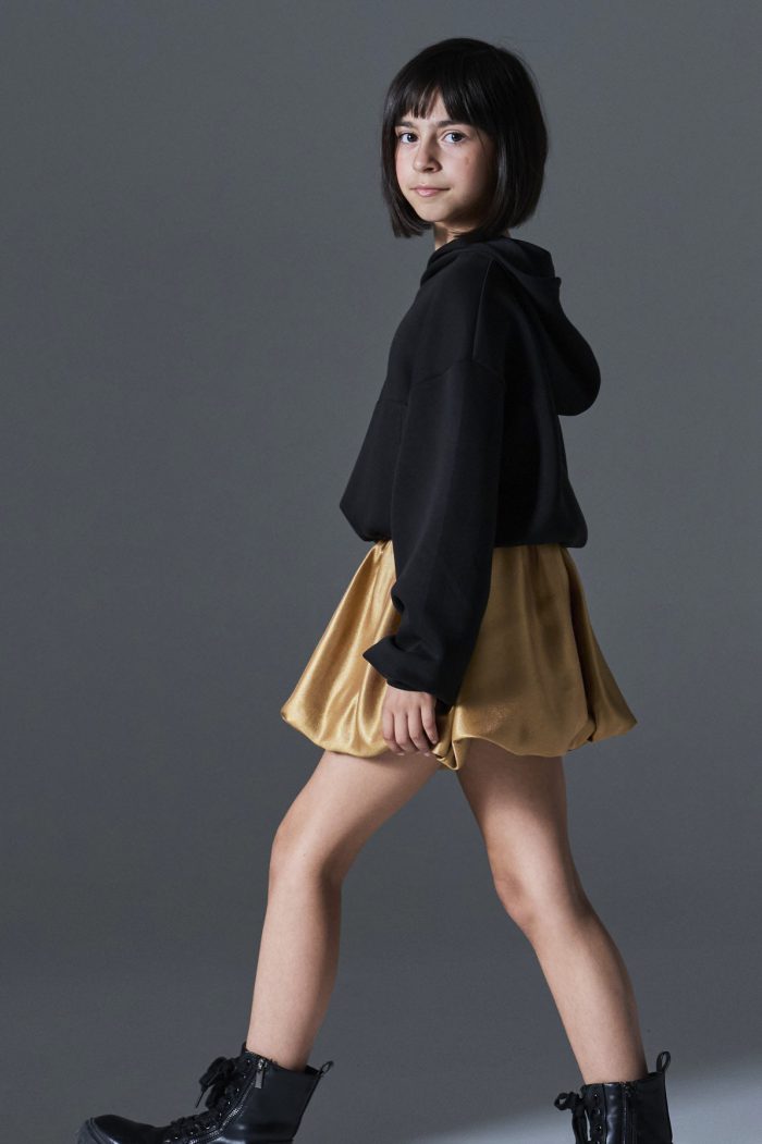 Φούστα balloon για κορίτσι, σε εντυπωσιακό χρυσό χρώμα. Διαθέτει ελαστική μέση για άνετη εφαρμογή ενώ η balloon γραμμή της δημιουργεί πλούσιο, «φουσκωτό» όγκο που χαρίζει κίνηση και στιλ. Κατασκευασμένη από σατινέ ύφασμα με διακριτική γυαλάδα, ιδανική για γιορτές, πάρτι και ιδιαίτερες περιστάσεις, αλλά και για στιλάτα casual looks με φούτερ ή μπλούζα.